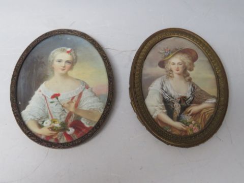 A PAIR OF 19TH CENTURY OVAL PORTRAIT MINIATURES OF LADIES, believed to be from the Nattier family, one signed Nattier lower right, in brass frames and glazed, 8 x 6 cm and 7.5 x 5 cm