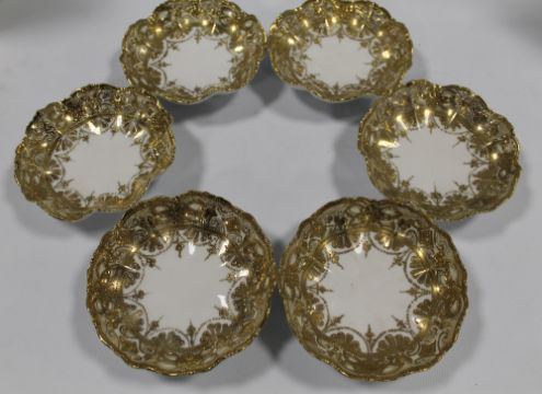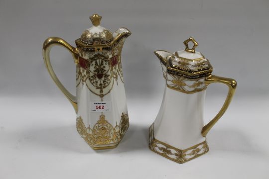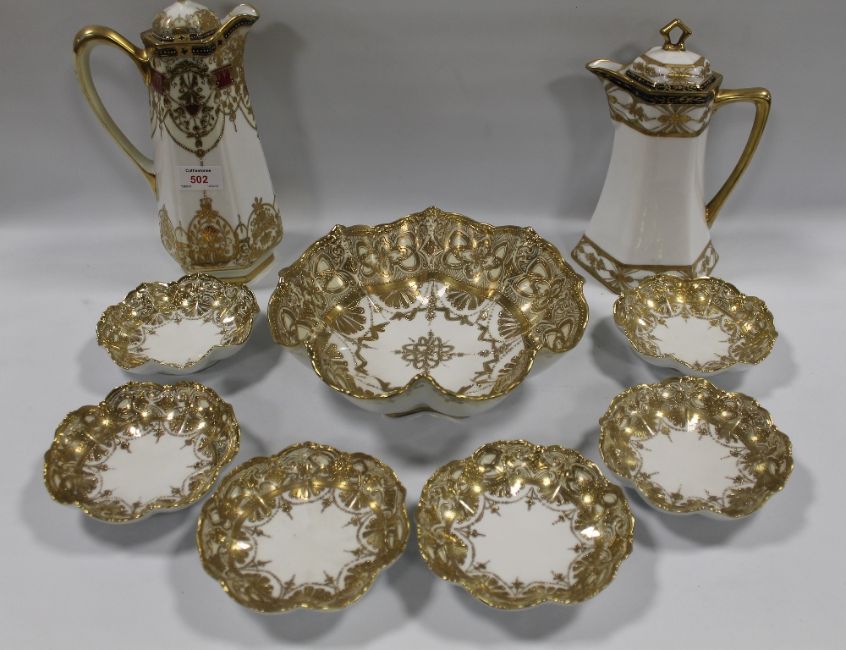 TWO LARGE NORITAKE COFFEE POTS, together with a Nippon gilt shaped bowl and six dishes (9)