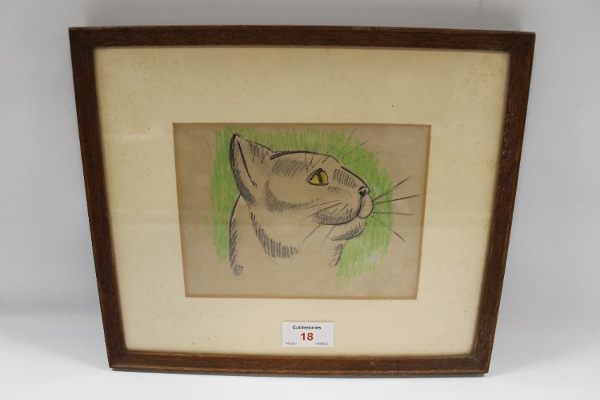 ELIZABETH MUNTZ (XX) A study of a cats head 'Portrait of a Gentleman', see label verso, signed with monogram lower left to middle, pastel and charcoal on paper, framed and glazed, 12 x 16 cm