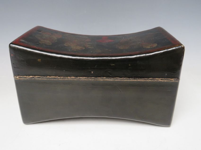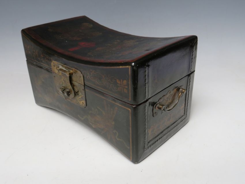 A 20TH CENTURY ORIENTAL LACQUERED PILLOW BOX, decorated with typical figurative detail, W 25.5 cm