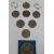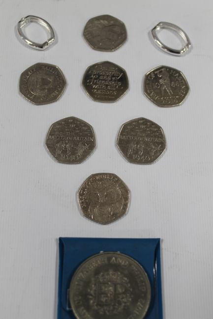 AN INLAID MICRO MOSAIC JEWELLERY BOX, including various collectable 50 pence piece coins - 2016 Mrs Tiggy Winkle, 2020 Brexit coin, 2 x 2015 Battle of Britain, 2019 Paddington Bear, 2016 Battle of Hastings, 1997 Jersey, 1972 Queen Elizabeth medallion and a hardwood Tibetan carved wooden votive plaque