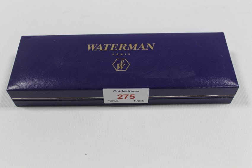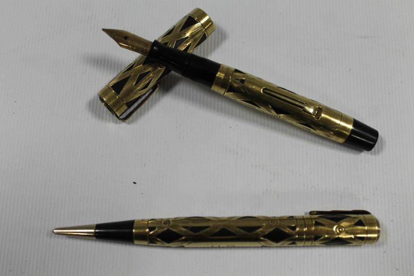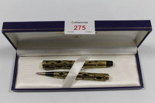 A VINTAGE CASED SET OF WATERMANS FOUNTAIN PEN AND PROPELLING PENCIL, both decorated with yellow metal overlays, stamped made in U.S.A., pen L 10.5 cm, pencil L 10.7 cm