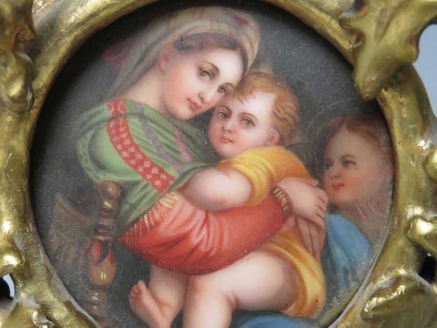 AFTER RAPHAEL - A 19TH CENTURY CONTINENTAL CIRCULAR PORCELAIN PLAQUE OF THE MADONNA & CHILD, unsigned in a carved wooden florentine frame, plaque Dia. 5.5 cm, frame 17 x 12 cm (largest)