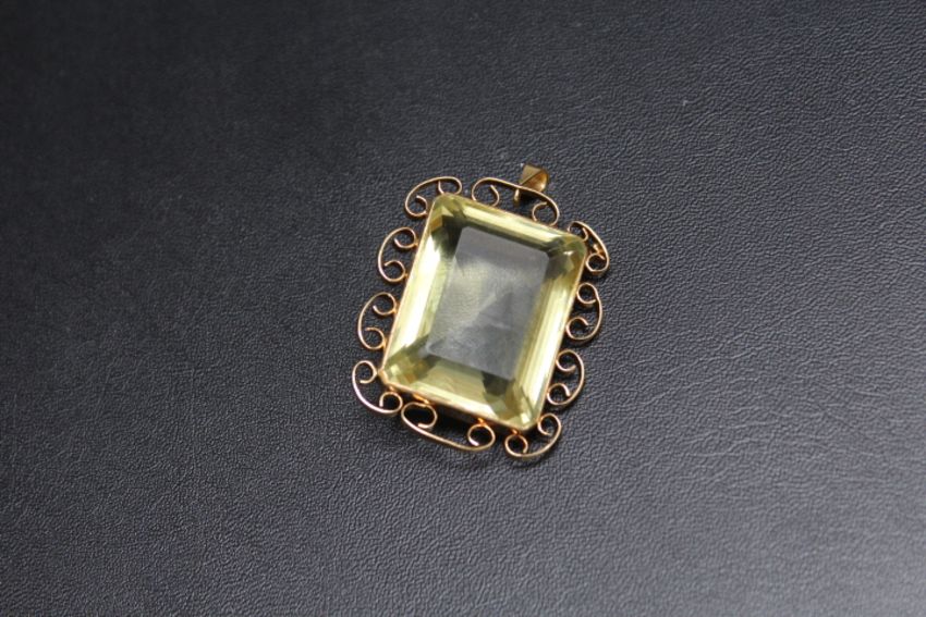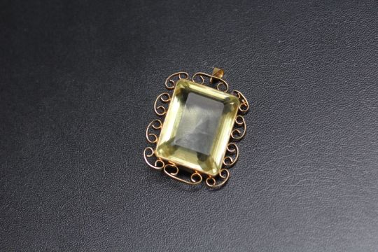 A LARGE GREEN / YELLOW RECTANGULAR PENDANT, possibly tourmaline? set in unmarked yellow metal, approx 30 mm by 22 mm with an estimated depth of 14 mm, approx weight 26g