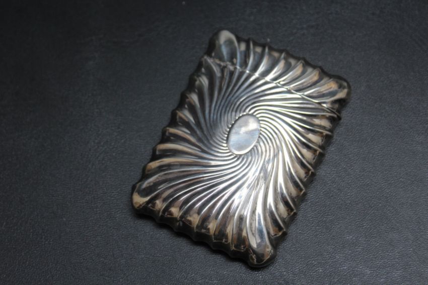 GEORGE UNITE - A HALLMARKED SILVER CARD CASE - LONDON 1889, having a swirling sun ray style repousse finish, approx weight 45.2g, H 8 cm
