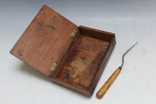 AN ARTIST'S TRAVELLING PAINT BOX, with small trowel, W 20 cm