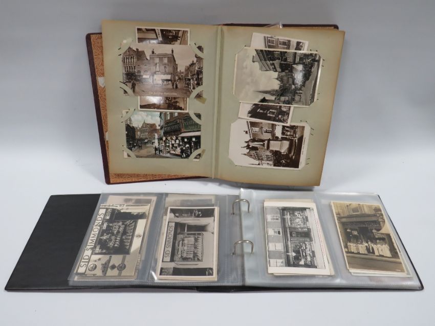 TWO ALBUMS CONTAINING VINTAGE POSTCARDS OF LOCAL INTEREST SHOWING VIEWS OF KIDDERMINSTER, the larger album contains over 250 postcards including views of The Railway Station, The Grammar School, the infirmary, the blaze at Brintons, The Post Office, the Library, the Town Hall, Oxford Street, Vicar Street, High street, Bull Ring, The Horse Fair, St Mary's Church, Worcester Cross, Station Hill, Comberton Hill etc., the smaller album contains approximately 50 views of Kidderminster including Minetts Hotel, Grosvenor Hotel & Restaurant, The Fountain Inn at Habberley Valley etc, both albums include Edwardian examples