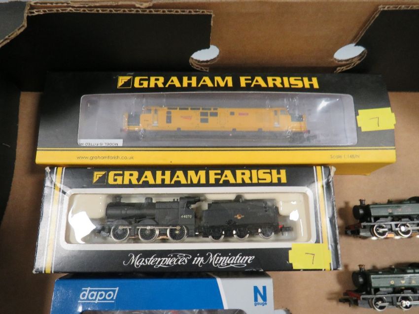 A TRAY CONTAINING 'N GAUGE' BOXED GRAHAM FARRISH 371-468A JOHN TILEY DIESEL LOCOMOTIVE, a boxed Graham Farrish 1845 Class 4F tender locomotive 0-6-0 British Rail, boxed Dapol locomotive, boxed Peco locomotive, and three unboxed locomotives