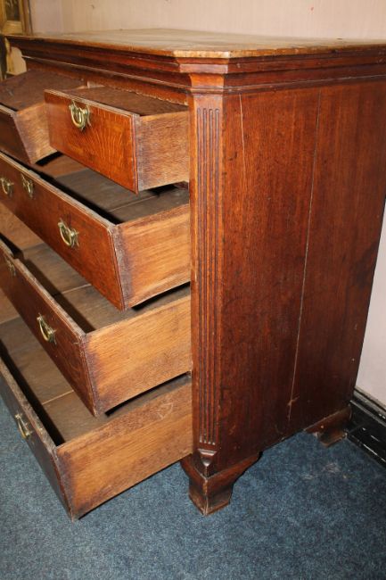 A 19TH CENTURY OAK CHEST OF FIVE DRAWERS, each drawer with crossbanded mahogany detailing, raised on shaped bracket feet, S/D, H 103 cm, W 108.5 cm