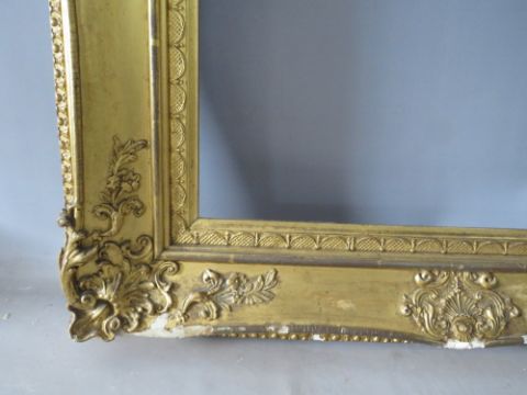 A 19TH CENTURY DECORATIVE GOLD SWEPT FRAME - SOME DAMAGES, frame W 14 cm, rebate 76 x 60 cm