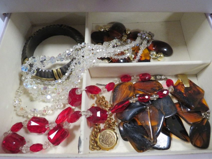 A JEWELLERY BOX AND CONTENTS, comprising a selection of vintage and modern jewellery items to include silver rings and earrings etc, vintage brooches, glass bead and pearl necklaces, a rhinestone set three row bracelet and a small selection of watches etc.