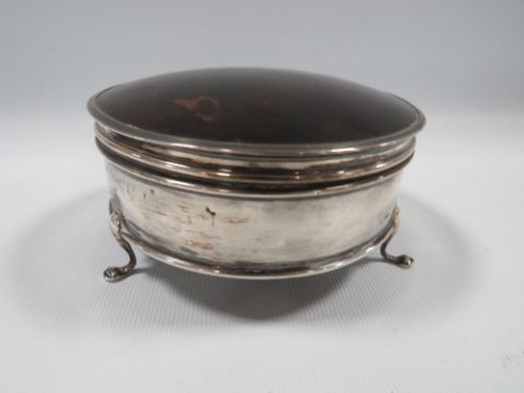 A HALLMARKED SILVER AND TORTOISESHELL CIRCULAR JEWELLERY BOX BY HORTON & ALLDAY - BIRMINGHAM 1919, Dia 10.5 cm
