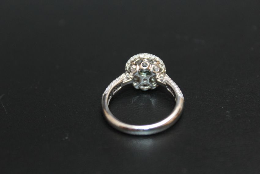 A HALLMARKED 18 CARAT WHITE GOLD BLUE DIAMOND CLUSTER RING, the central brilliant cut blue diamond being of an estimated 1 carat and according to insurance cert it is a treated stone, with brilliant cut diamond surround and shoulder insets totaling an estimated 0.77 carat, ring size M 1/2