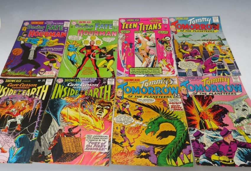 EIGHT DC SHOWCASE COMICS, to include Doctor Fate and Hourman programmes 55 and 56, Tommy Tomorrow programmes 41, 46 and 47, Return of The Teen Titans programme 59 and Cave Carson Adventures Inside Earth, programmes 48 and 49