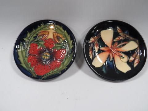 A MOORCROFT 2004 COLLECTORS CLUB PANACHE PATTERN PIN DISH, impressed and painted marks to base, Dia. 11.5 cm, together with a Moorcroft Pheasants Eye pattern pin dish, Dia. 11.5 cm (2)