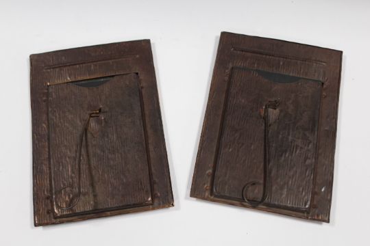 A PAIR OF ARTS AND CRAFTS STYLE COPPER PHOTOGRAPH FRAMES, rectangular from, each with stylised detail and turquoise plaques, 22 x 15.5 cm (2)