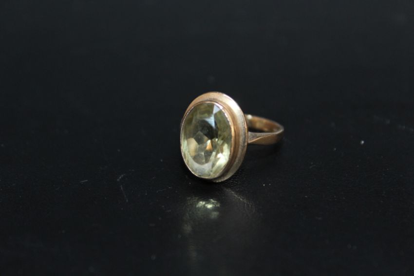 A HALLMARKED 9 CARAT GOLD DRESS RING, set with a pale olive green quartz style oval stone measuring an estimated 14mm by 10mm, ring size P