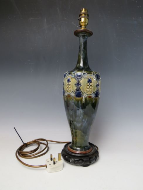 A TALL DOULTON LAMBETH STONEWARE LAMP BASE, of slender form, the design with beaded embellishment , raised on a wooden base, overall H 49 cm, inc fitment