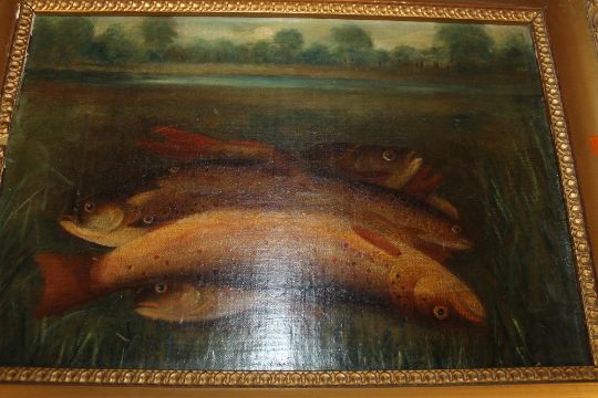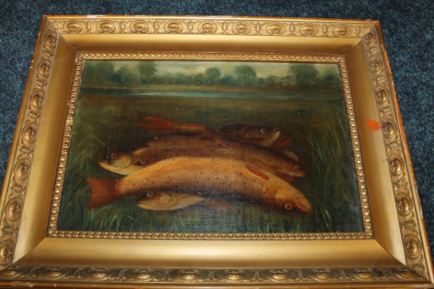 A 19TH CENTURY STUDY OF A TROUT ON A RIVERBANK 'THE DAYS CATCH', unsigned, oil on canvas laid on card, framed, 23 x 35 cm