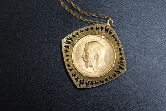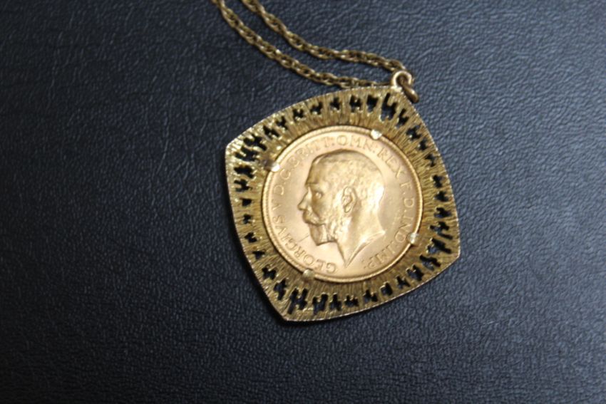 A GEORGE V FULL SOVEREIGN DATED 1913 MOUNTED IN HALLMARKED 9 CARAT GOLD PIERCED BARK EFFECT PENDANT ON A 9CT CHAIN, approx combined weight 15g