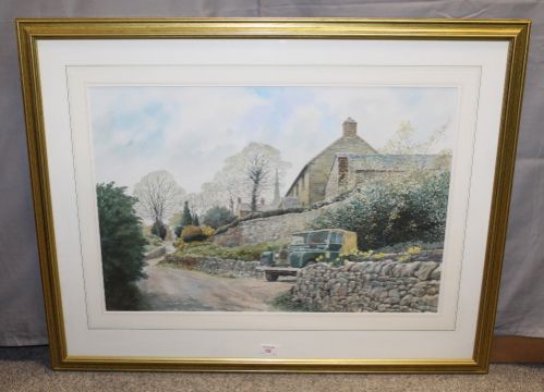MATTHEW GREENE (b.1967). Lincolnshire artist, village scene with \Land Rover 'Springtime, Butterton', see verso, signed lower right, watercolour, framed and glazed, 41 x 61 cm