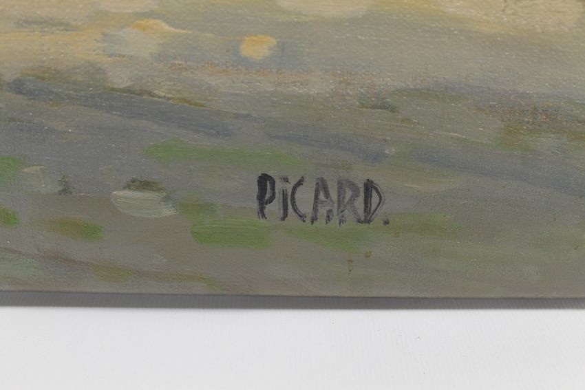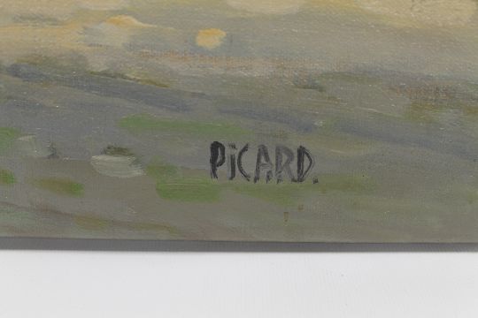 PICARD (XX). French school, continental coastal scene with figures at an inn, signed lower right, oil on canvas, unframed, 60 x 91 cm