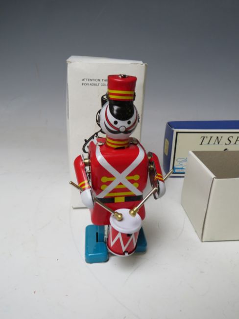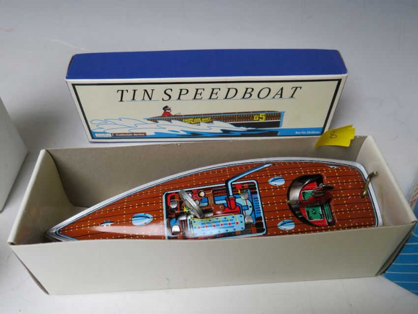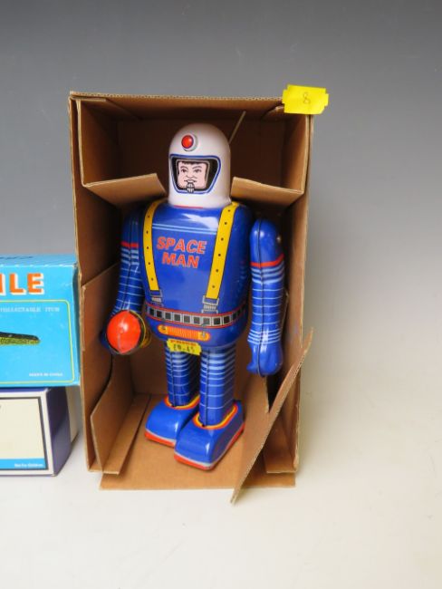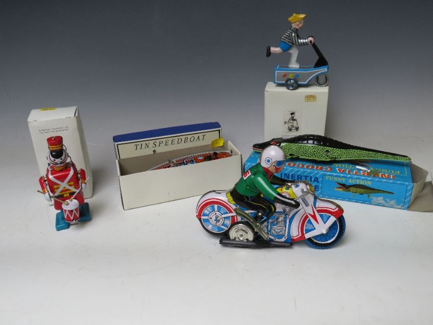 A COLLECTION OF SIX TIN PLATE TOYS, (five are boxed), to include Inertia Crocodile MS224, Schylling speedboat, Spaceman Robot, Drummer, Scooter and Motorbike