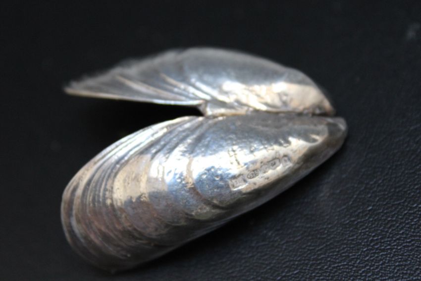 A MODERN HALLMARKED SILVER MUSSEL EATING PINCER IN THE FORM OF A SPRING HINGED MUSSEL SHELL, approx weight 15.5g, W 5 cm