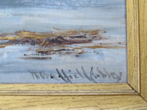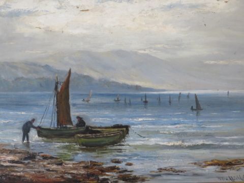 HENRY HADFIELD CUBLEY (1858-1934). Stormy coastal scene with boats and figures 'In Rothsay Bay', see verso, signed lower right, oil on canvas, framed, 39 x 59 cm