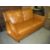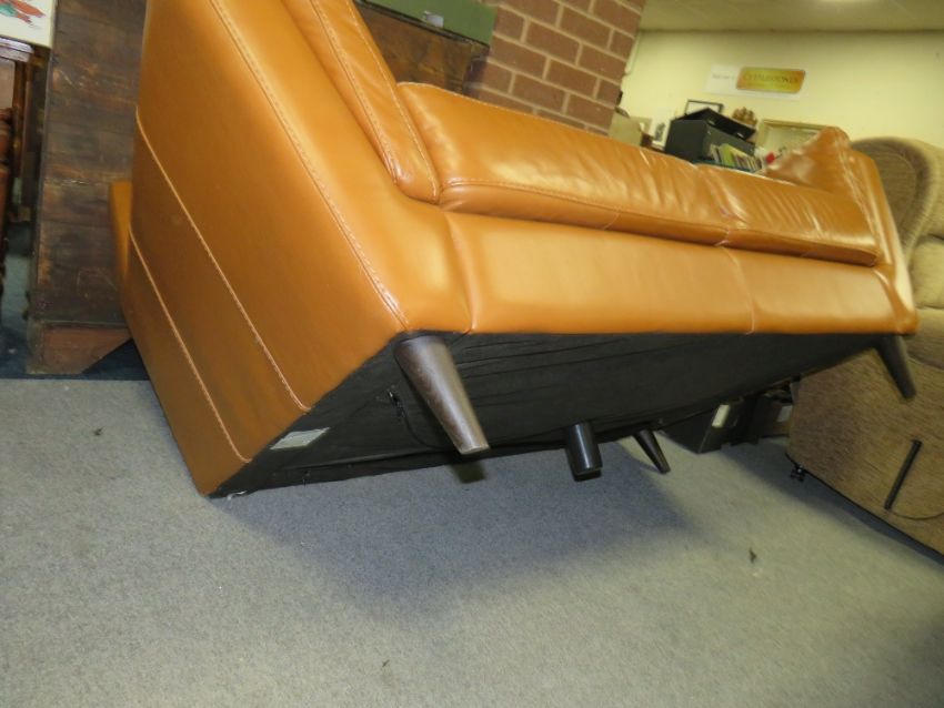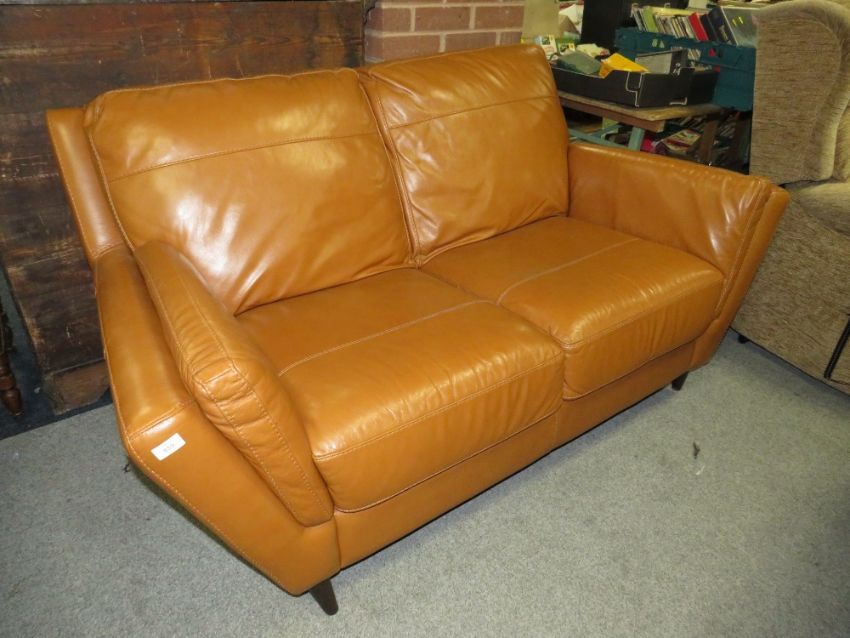 A MODERN TAN LEATHER TWO SEATER SETTEE - MINUS BACK FOOT