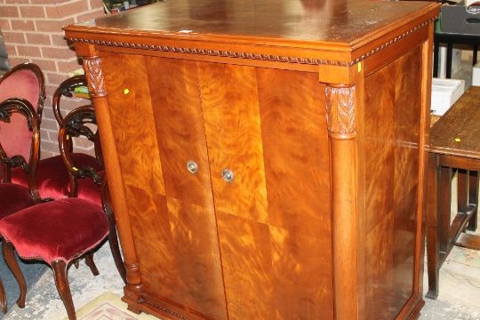 A LARGE MODERN MAHOGANY MEDIA CABINET WITH DRAWER ON THE INSIDE