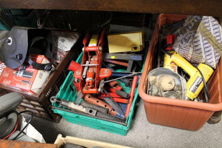 THREE BOXES OF MECHANICS TOOLS TO INLCUDE TROLLEY JACK AND AXLE STANDS