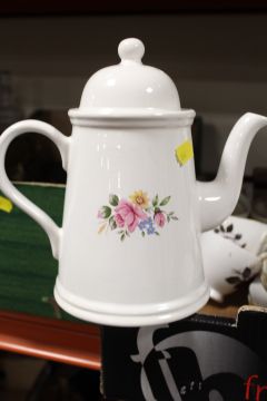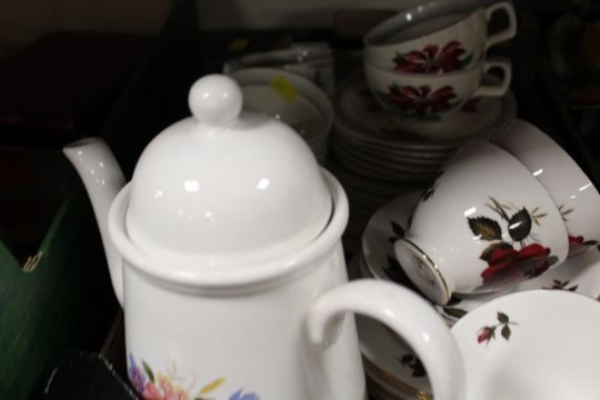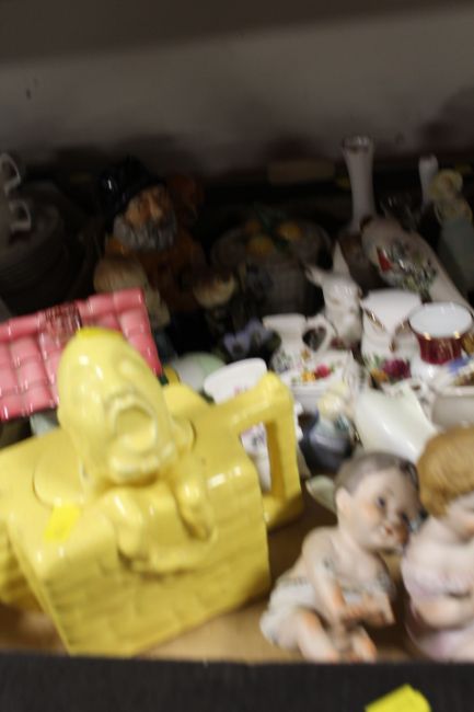 THREE TRAYS OF ASSORTED CERAMICS TO INCLUDE WEDGWOOD , NOVELTY TEA-POTS ETC
