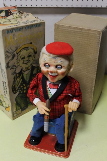 A ROSKO VINTAGE BATTERY OPERATED MR McGREGOR FIGURE TOGETHER WITH A BATTERY OPERATED FIGURE OF A PAIR OF TOADS