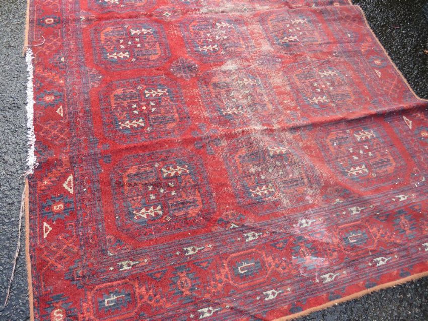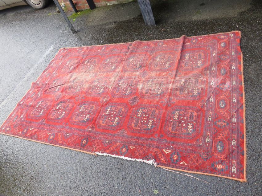 A VINTAGE RED WOOLLEN RUG 254 X 154 cm