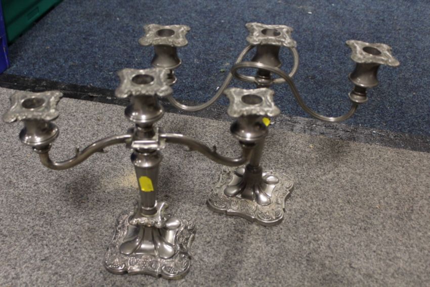 A TRAY OF ASSORTED METALWARE ETC TO INCLUDE CANDELABRA