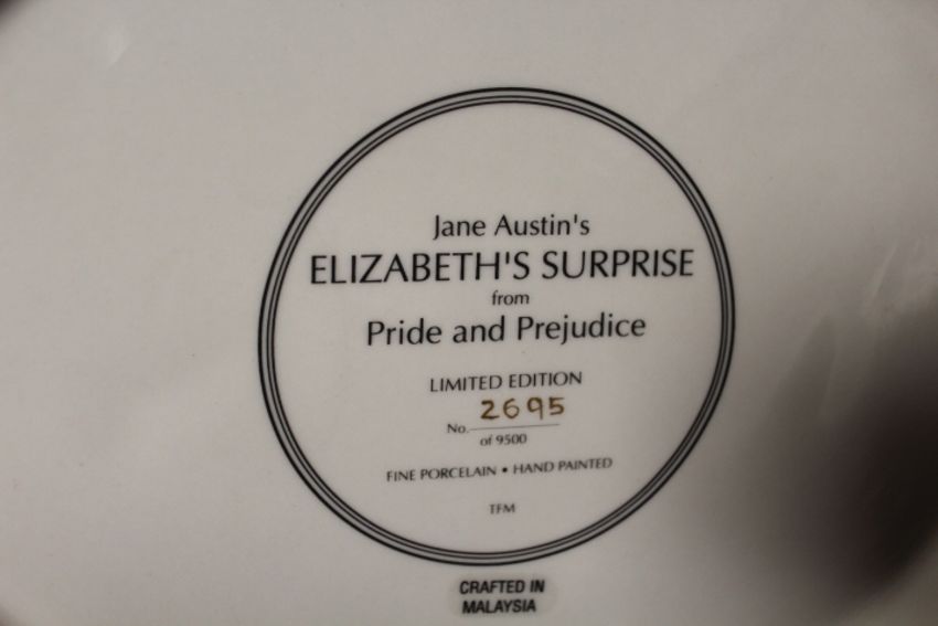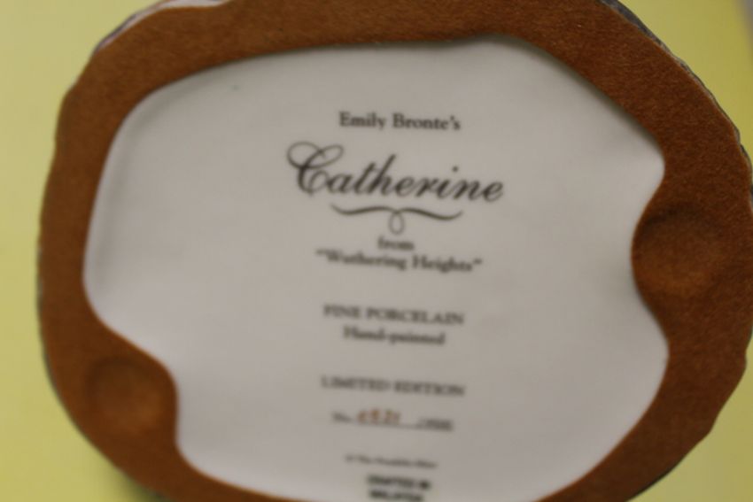 A PAIR OF FRANKLIN MINT PORCELAIN FIGURES ELIZABETH SURPISE FROM PRIDE AND PREJUDICE TOGETHER WITH CATHERINE FROM WUTHERING HEIGHTS