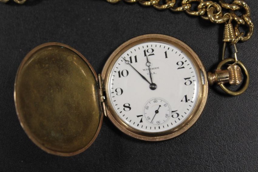 A GOLD PLATED WALTHAM FOUR HUNTER POCKET WATCH ON A GOLD EFFECT CHAIN