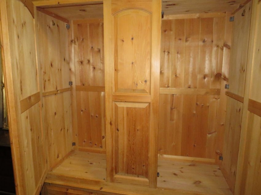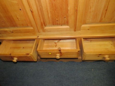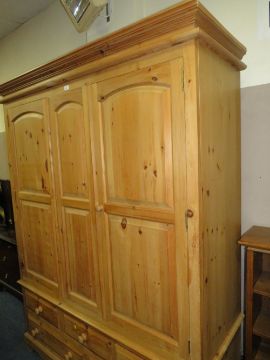 A LARGE TRIPLE MODERN PINE WARDROBE WITH DRAWERS BELOW - H 209 cm, W 160 cm