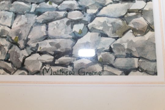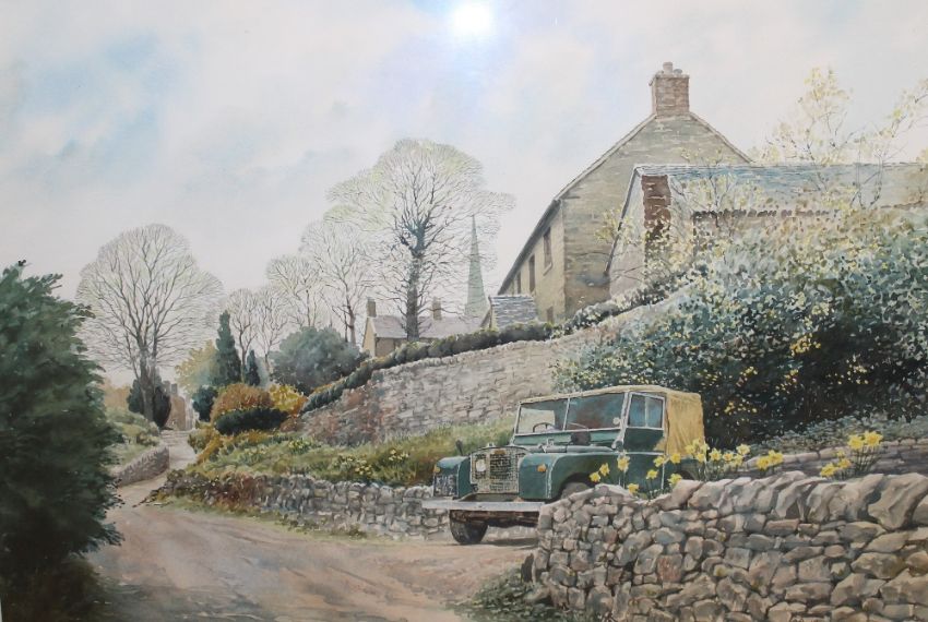 MATTHEW GREENE (b.1967). Lincolnshire artist, village scene with \Land Rover 'Springtime, Butterton', see verso, signed lower right, watercolour, framed and glazed, 41 x 61 cm