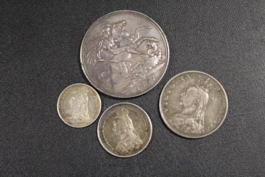 FOUR VICTORIAN SILVER COINS TO INC AN 1897 CROWN