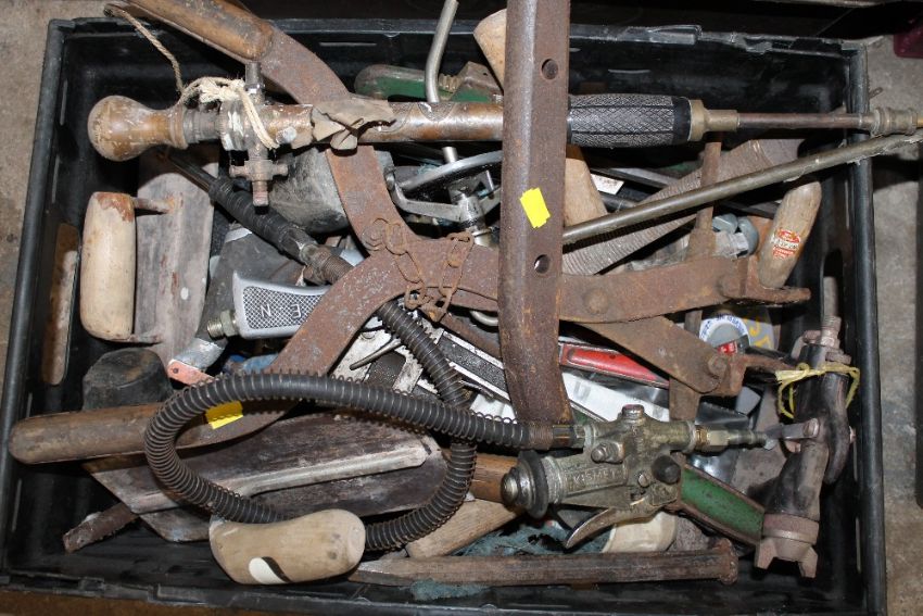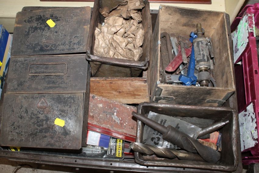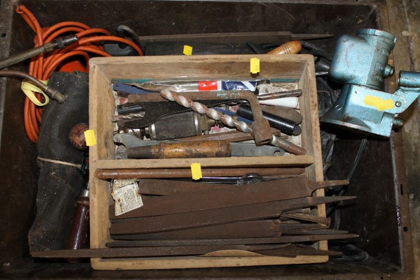 FOUR TRAYS OF TOOLS PLUS ONE BOX TO INCLUDE POWER TOOLS