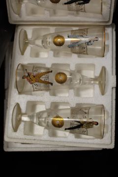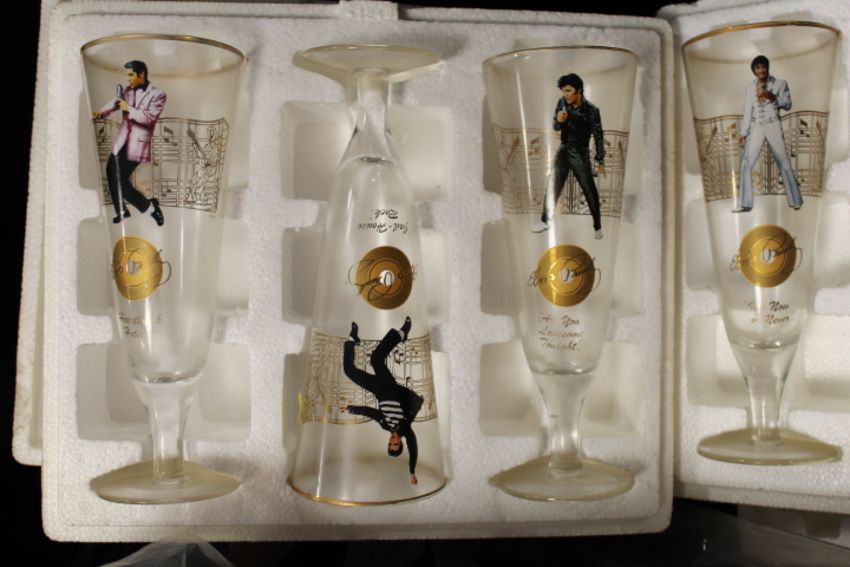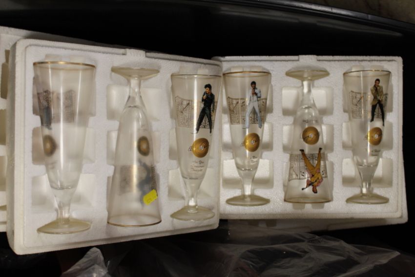 A SET OF ELVIS HIGH BALL GLASSES WITH WOODEN DISPLAY STAND