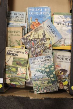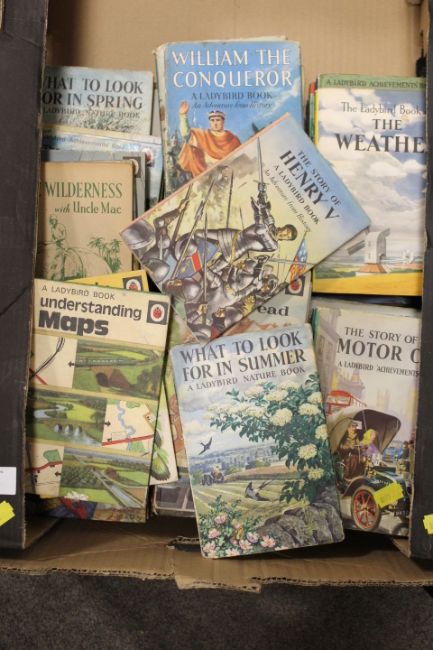 A TRAY OF ASSORTED VINTAGE LADYBIRD BOOKS TOGETHER WITH A TRAY OF BLUE PETER ANNUALS