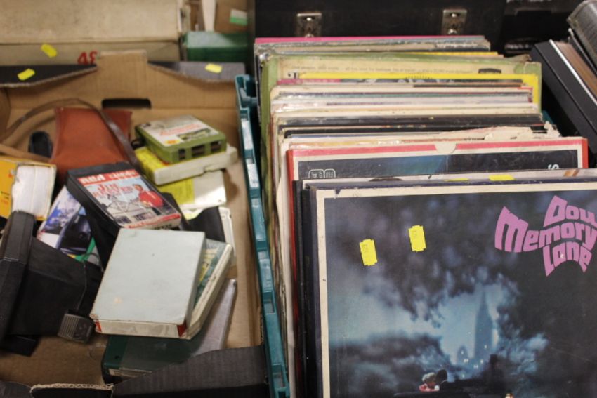 A TRAY OF VINTAGE LP RECORDS TOGETHER WITH A TRAY OF SUNDRIES TO INCLUDE SUPER 8 CASSETTES