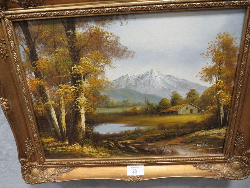 A GILT FRAMED OIL ON CANVAS OF MOUNTAIN RIVERSIDE SCENE