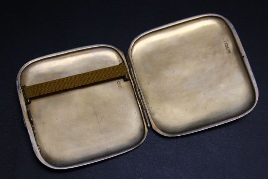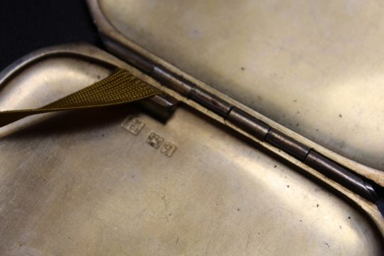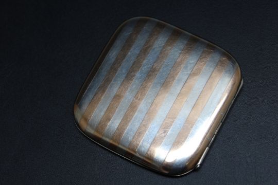 SAMPSON MORDAN & CO - A HALLMARKED SILVER CIGARETTE CASE, decorated with what appears to be rose gold stripes, dated London 1911, approx weight 103.7g, W 8 cm