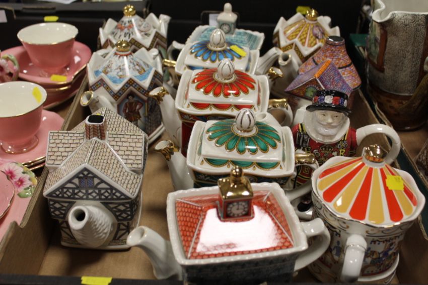 A TRAY OF ASSORTED COLLECTABLE SADDLER TEA POTS