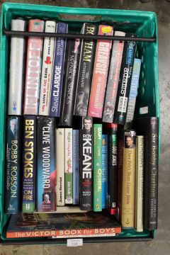 A TRAY OF ASSORTED HARD BACK BOOKS TOGETHER WITH A LION SOFT TOY