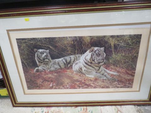 A FRAMED AND GLAZED ANTHONY GIBBS 'WHITE TIGERS EVER WATCHFUL' SIGNED PRINT
